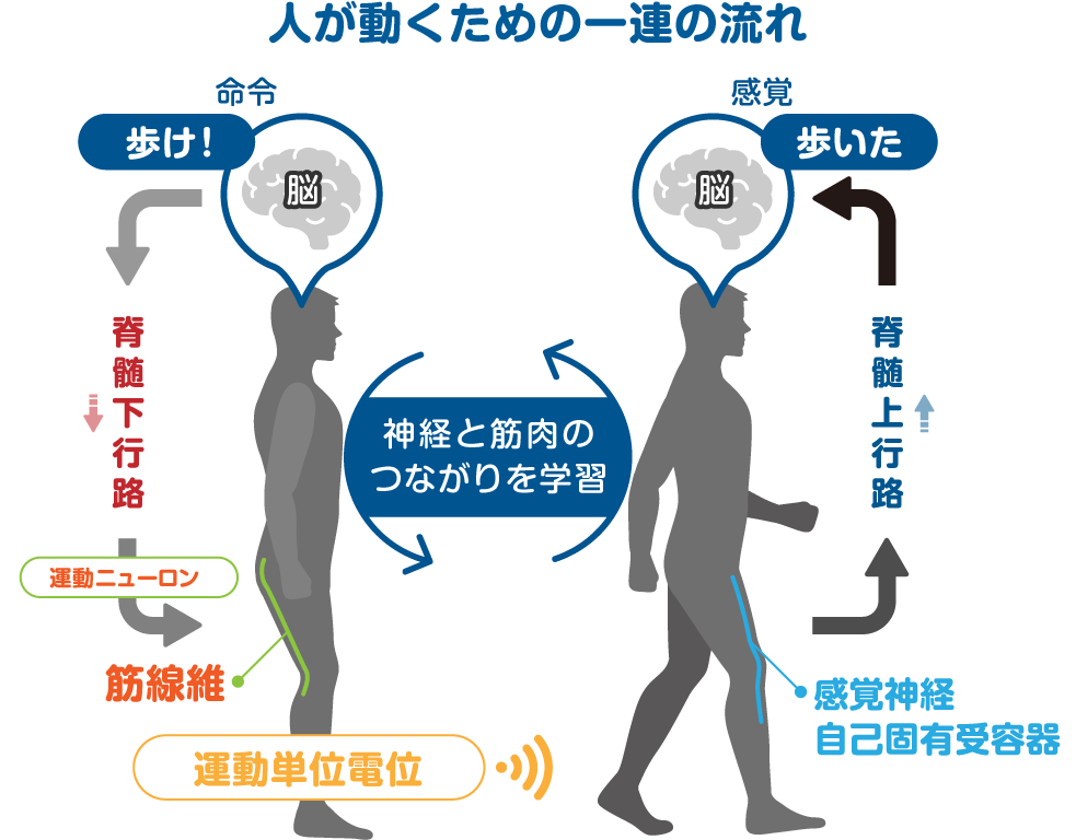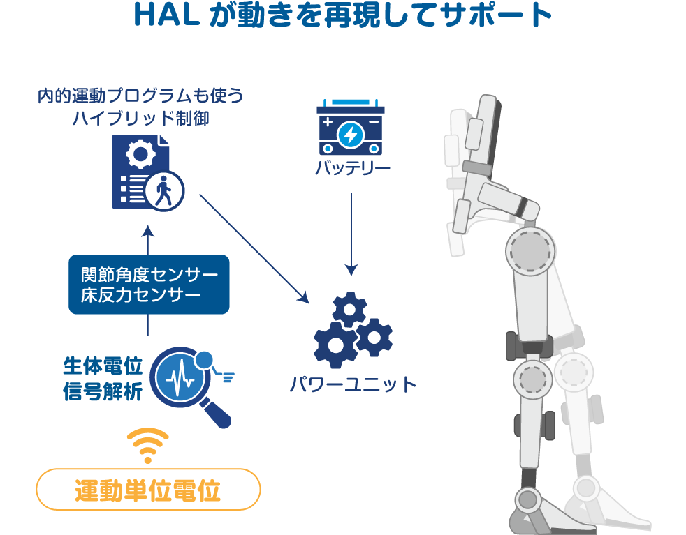 なぜ人とロボットは一緒に動けるのでしょうか。開発された「HAL」というサイボーグ型ロボットは脳由来で下肢が歩行のために「動く」ための信号を皮膚の表面から、実際に動く前に読み取って動く仕組みになっています。手や足を動かすなどの目的動作が不自由な方等が、動作がしっかりとイメージできていなくともプログラムされた自然な動きを再現してサポートする仕組みです。
