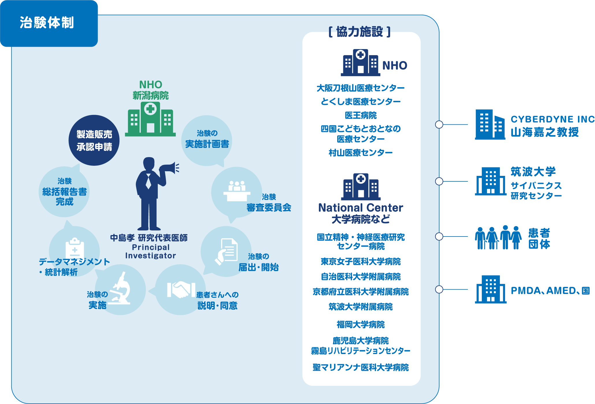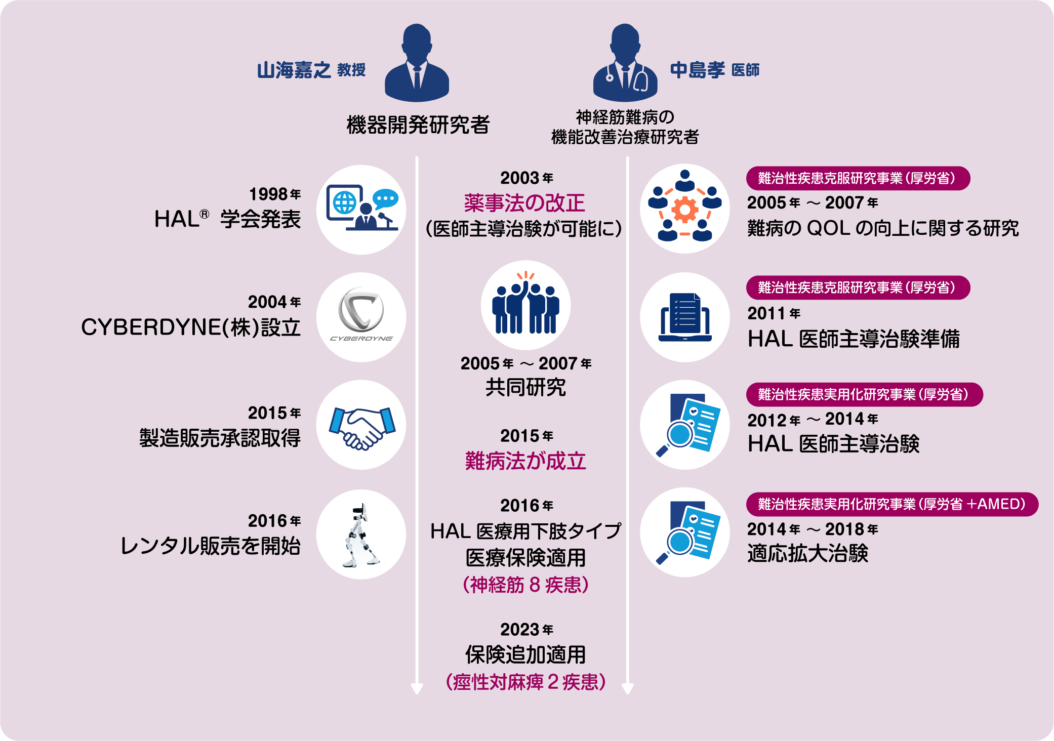 2005年、中島孝医師は、治療がむずかしく慢性の経過をたどる神経筋難病に対して、装着型ロボットスーツHALの医療機器化を目指す共同研究を始めました。2011年からは中島孝医師主導で、医師主導治験の準備が始まり、2012年から2014年にかけては、難病に対する医療機器実用化の事業が厚生労働省から認められました。さらに2015年には新たに難病法が成立し、難病患者を対象とした治療の試験が進みました。