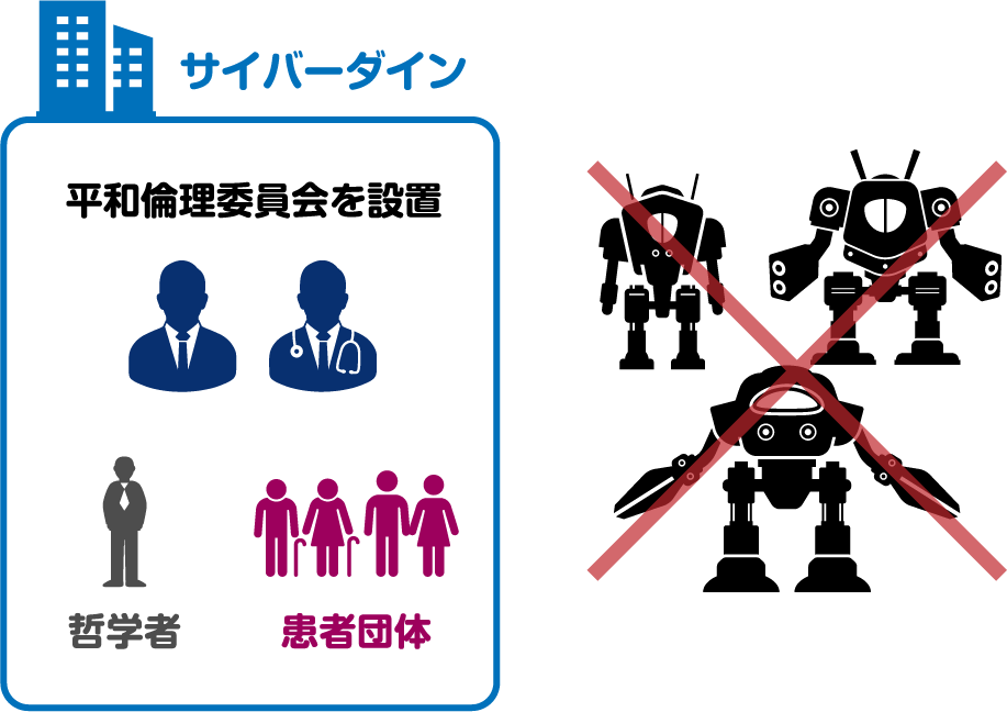 HALを使えば、体の働きをとても強くできるため、スポーツ選手や兵士の力を上げる「体の改造」にも使えてしまいます。だから、研究の始まりから「倫理(正しい使い方)」についての話し合いを続けてきました。会社の中にも「平和倫理委員会」というグループを作り、研究チームには哲学者や患者さんのサポート団体も加わって、いろいろな立場から意見を出してもらいました。