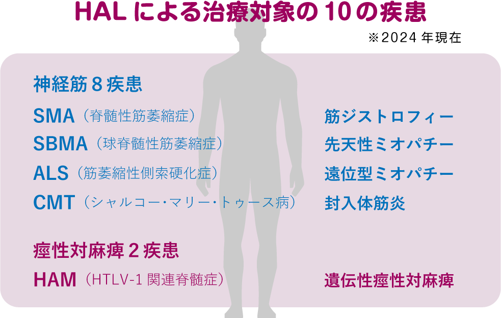 HAL医療用下肢タイプは医療機器として世界で初めて神経筋8疾患に対して医療保険の適用が認められました。