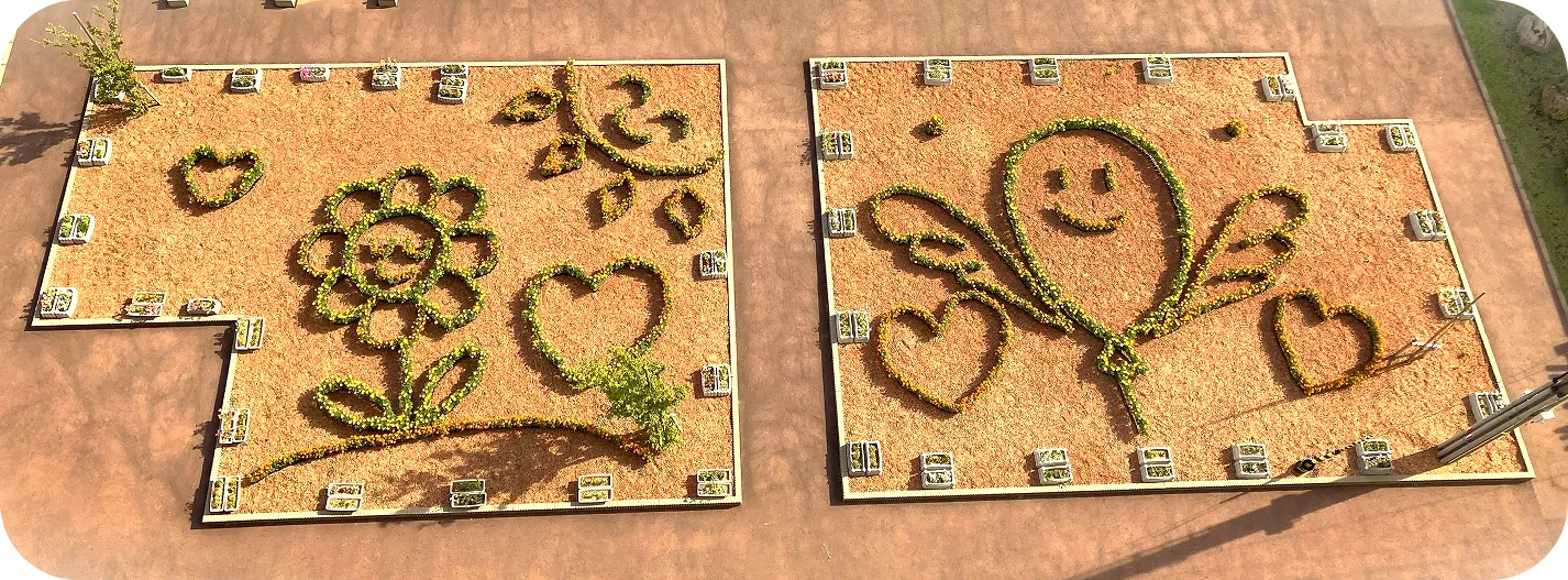 院内駐車場内にあるべんがらガーデンをマリーゴールドの花文字で彩りました。マリーゴールド1,600株で彩りされた光景はとてもきれいでした。
