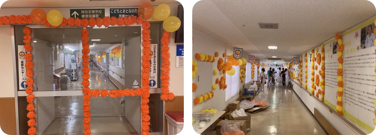 正面玄関から新棟入口までの中央廊下に、オレンジ色・黄色の風船や花紙・色画用紙で作った花で飾りました。