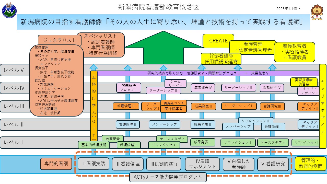 新潟病院が求める看護師像「その人の人生に寄り添い、理論と技術を持って実践する看護師」へ近づくため、また自分らしい看護師を実践できるよう支援しています。