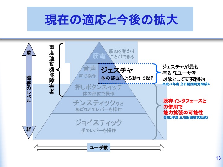 今後、就労支援ツールとしても積極的に導入し、仕事での使用、学校教育現場での学習支援、生活の場で利用を広める予定です。現在、研究協力者として使用している方には、実用的な道具として提供を行いたいと考えています。現在まで60人を超える利用者が試用され、長期使用の利用者は10名程度となりました。国外では、イタリア、イギリスやフランスなどでデモンストレーションを行い世界で使ってもらえるように活動を開始しています。 今回、実用化成功の証として、柏崎市が世界で初めて、日常生活用具給付の対象として正式に認定したことは、大きな一歩であり柏崎から全国へ、そして世界へ展開できると考えられます。私達の研究グループは一丸となり、重度の運動障がい者のノーマライゼーション、社会参加を促進するツールとして提供する予定です。