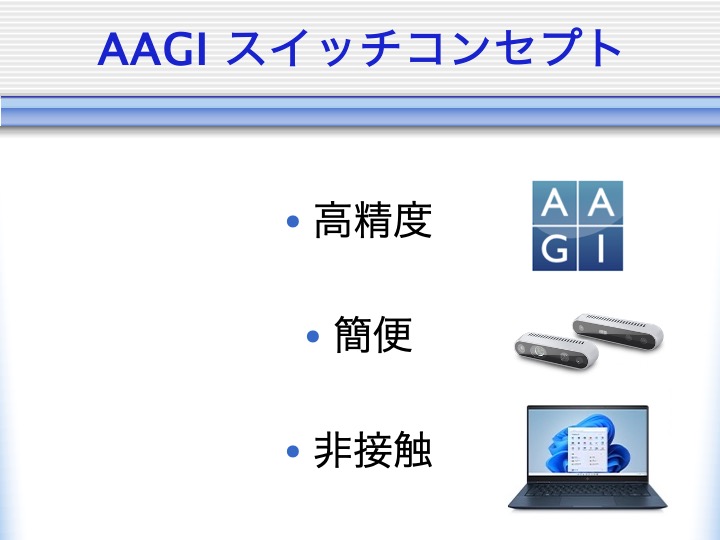 本スイッチの開発コンセプトは高精度、簡便、非接触のコンセプトで2012年から開発を開始しました(参照)。市販の3Dカメラ(例えば、インテル® RealSense™ デプス・カメラ等)と独自に開発したパソコンのAAGIアプリケーションで制御することで非接触、非拘束インタフェースを実現しました(登録特許および登録商標については文末を参照)。30cm-1m程度の距離から3次元カメラで捉えることで使用者の小さな動きを精度良く認識することができます。
