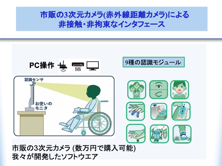 動作は「頭の動き」「ウインク」「口・舌」「指の折り曲げ」「膝の開閉」「足踏み」「手前に動かす」「微細な動き」の9つの動作認識モジュールを用意しています。この認識した動作をパソコンへの入力(キーボード操作)を行い直接パソコン操作したり、パソコンからリモコンへ接続し部屋の照明をつけたり、エアコンをつけたりなどの周囲の環境制御を行うことができます。