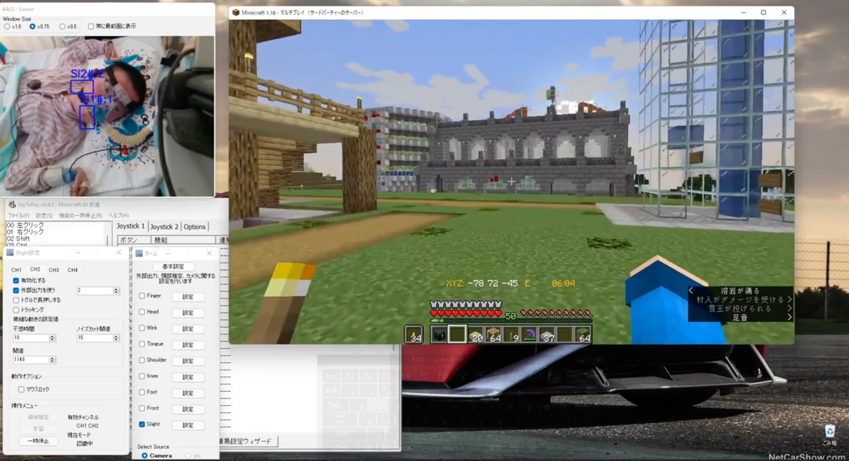 また、仮想世界を作るゲーム「マインクラフト」で街を作り、院内や院外の仲間を募ってその世界で生活をしています。また別の在宅生活中の使用者(デュシェンヌ型筋ジストロフィー)は就労として、パソコンの音声ソフトを用いて会議録の文字起こしを行なっていますが、AAGIを使用することで、入力スピードが2.5倍に上昇し、仕事量を容易に増やせる事ができました。