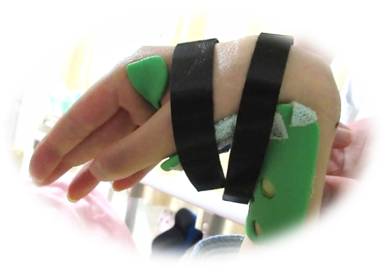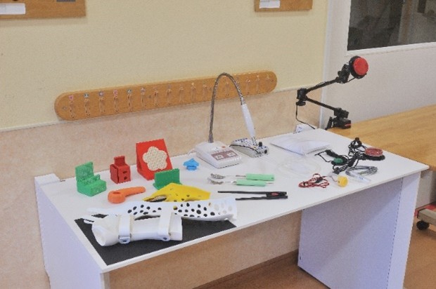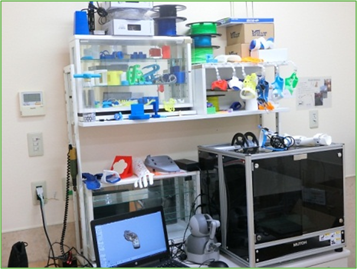 作業療法部門には3Dプリンタを設置し、患者さんが様々な機器を操作する際に用いるスイッチを取り付けたスプリント(装具)を作成しています。患者さんの手のCT画像をデータ化することで、3Dプリンタによる個々手の形状に合わせたスプリントが作成できます。また、自助具をパソコンのソフトウェアでデザインし患者さんのニーズにあった自助具の作成も行っています。