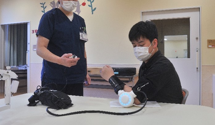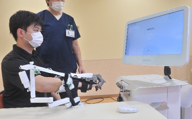 当院では患者さんの手指のリハビリテーションとして、MELTz®手指運動リハビリテーションシステムを導入しています。手指の運動練習のためのロボットリハビリテーション機器であり、前腕に貼付した電極から指を曲げたり伸ばしたりする運動意図をAIが予測します。動かそうと思ったときにリアルタイムでロボットが動き、手の動きをアシストします。これにより、指の反復運動をすることで指の運動機能改善を目指します。脳卒中(急性期、回復期、維持期)の患者さんのみならず、神経・筋疾患の患者さんにも適応しています。