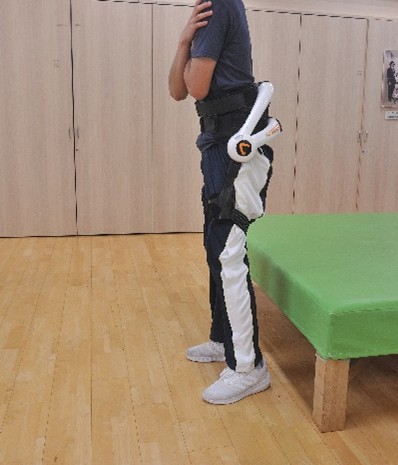 患者様にHALを装着して頂き、立ち上がり、立位、歩行練習などのリハビリテーションを実施します。HALの使用回数は9回を1クールとし、1クールを目安に使用します。1回の歩行練習には、装脱着を含めて約1時間程度かかります。HAL使用前後に治療効果を比較するために身体計測、筋力測定、歩行評価など必要事項を評価します。評価の際、HALの有効性を医師、理学療法士が医学的に評価を行うために写真撮影、動画撮影を一定の条件で行いますのでご協力お願い致します。