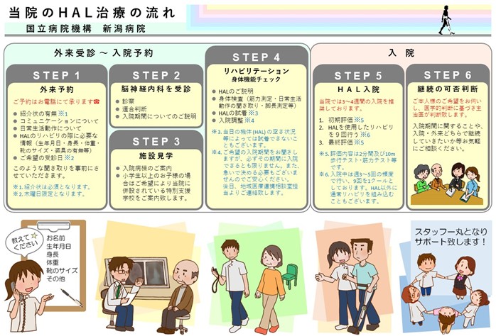 - 現在通院されている病院の主治医と相談の上、紹介状を貰い、当院へHALに関する受診の申し込みをしてください。医師の診察と理学療法士の評価後、医師がHALの適応を判断します。適応となりご希望がありましたら入院の予約をしてください。