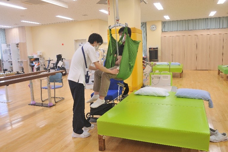 理学療法室と作業療法室には天井走行リフトが設置されています。天井走行リフトを活用することにより、患者さんが快適な姿勢でかつ安全に車椅子、ベッド間を移乗することが出来ます。