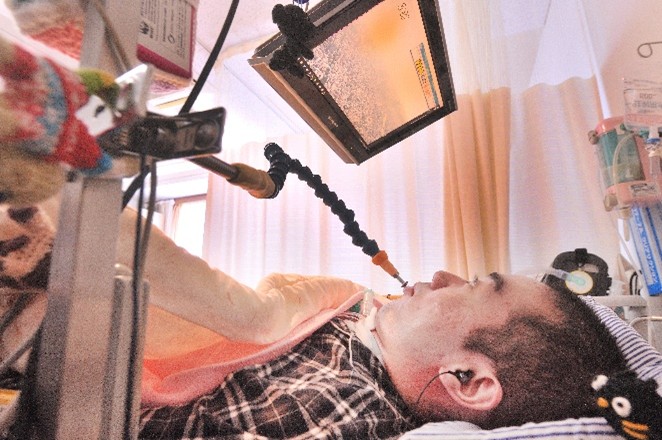 近年、新しい入力装置(スイッチ)として急速に普及してきているのが「視線入力装置」です。これは手足が思うように動かない人の「目」の動きを検出することによって、PCを通じてコミュニケーションを図ったり、インターネットやSNSを楽しめるようにする機器です。またPCを操作できなくても目の動きを検出することによって、その人の意図、想いが読み取りやすくなりコミュニケーションを促進させる効果もあります。
