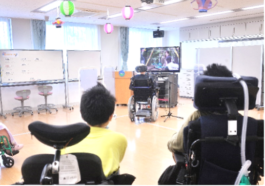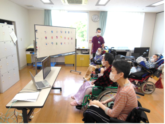 筋ジストロフィー・ALS等病棟の「オンライン交流会」。遠方の患者さんと交流会を行い、情報交換を行っています。九州の病院の患者さんとカードゲームで競いました。