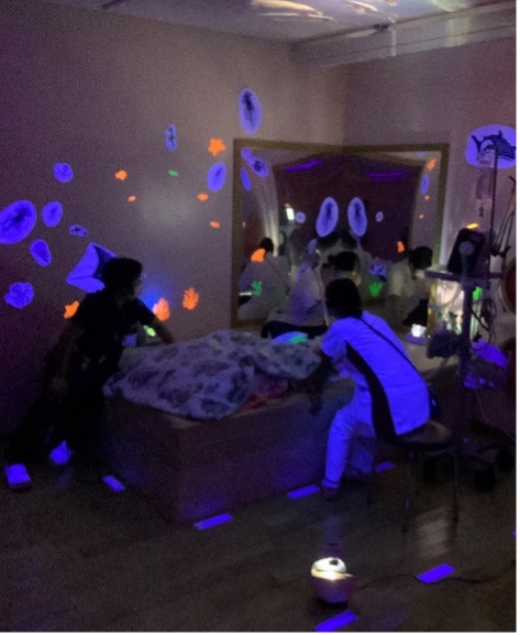 スヌーズレン活動。光や音、香り、感触、揺れ等、感覚刺激等の環境設定をした空間です。くつろいだ気分で、患者さんと職員が一緒に過ごします。