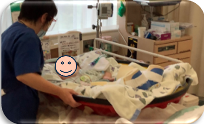 4階病棟内Post-NICU。人工呼吸器等の医療機器を必要とする方が利用されています。保育士や児童指導員が一人ひとりの年齢や状態に応じた発達支援を行います。聴く、見る、触るなどの感覚刺激を中心に様々な体験を重ねていけるようにかかわります。写真は「ゆらんこ」の様子です。ベッド上で揺れを感じています。